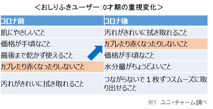 しかしながら、低月齢の赤ちゃんはお肌が敏感で、肌トラブルに見舞われることも多く、保護者にとって大きな悩みとなっています。実際にCOVID-19流行の前と後でアンケート調査をしたところ、「カブレたり赤くなったりしないこと」といった肌に関する事柄を重視するおしりふきユーザーが増えていることが分かりました。※1