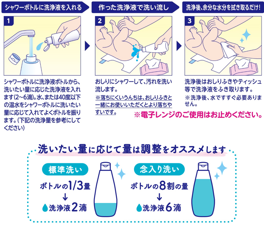 ・普段、おしりふきで擦りすぎておしりが赤くなってしまうことがあったが、この洗浄液はお肌も赤くなることがなく、やさしいと感じました。