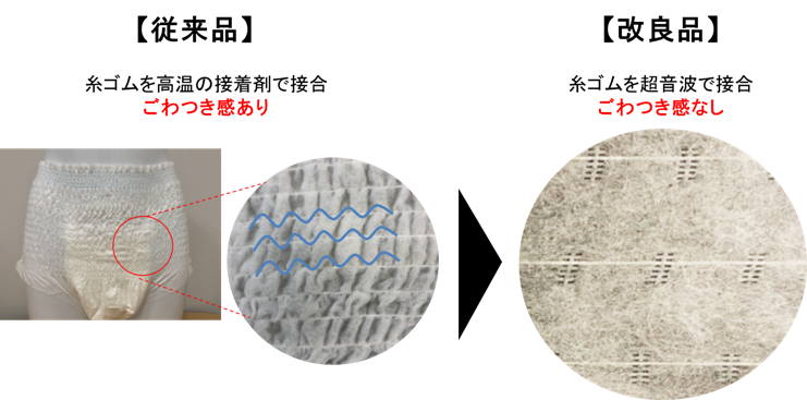 ・ウエスト部分の糸ゴム接着を従来の接着剤使用から“超音波接合”へと改良することで、不織布本来の柔らかさを損なわず、しめつけ感を改善しました。