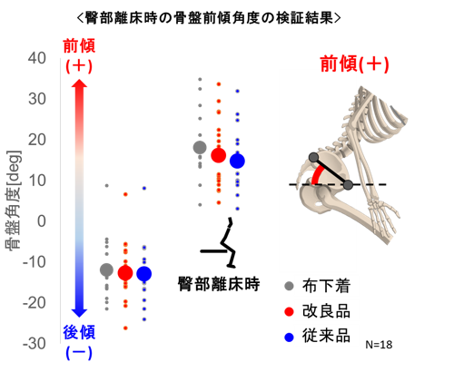 今回、紙パンツとパンツ用パッドの組み合わせによる立ち上がり動作への影響について検証しました。股下部分が身体の形状に合わせて変形する新改良の紙パンツとパンツ用パッドの組み合わせでは、立ち上がり動作時の骨盤の前傾角度が従来品と比較して改善しており、布の下着を装着した時の動作により近づくということが明らかになりました。