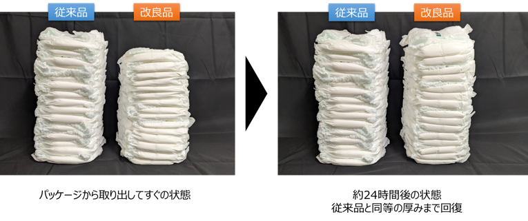 ・新たな圧縮率の商品も、パッケージ開封後約24時間で従来品と同等の厚みにまで回復します。