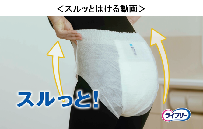 ・しめつけ感の軽減により、より軽い力で紙パンツを引き上げ下げでき、スムーズな着脱が可能です。