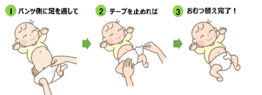 ・片足を通して、開閉式のサイドテープを使うことで、おむつ交換が簡単に行えます。