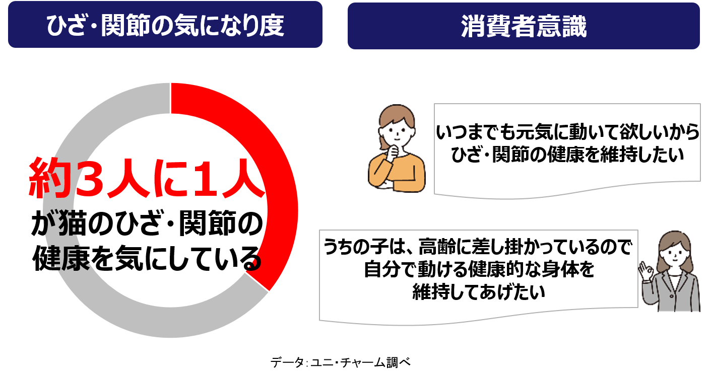 また、猫を単なるペットとして扱わず、「家族の一員」に位置付けるいわゆる“家族化”が進み、飼い主様の愛猫の健康管理への意識は確実に高まっています。特に年齢が高めの愛猫に対しては「いつまでも元気に動ける身体でいてほしい」「高齢になっても自由に動ける健康的な身体を維持してあげたい」といった想いが高まっています。