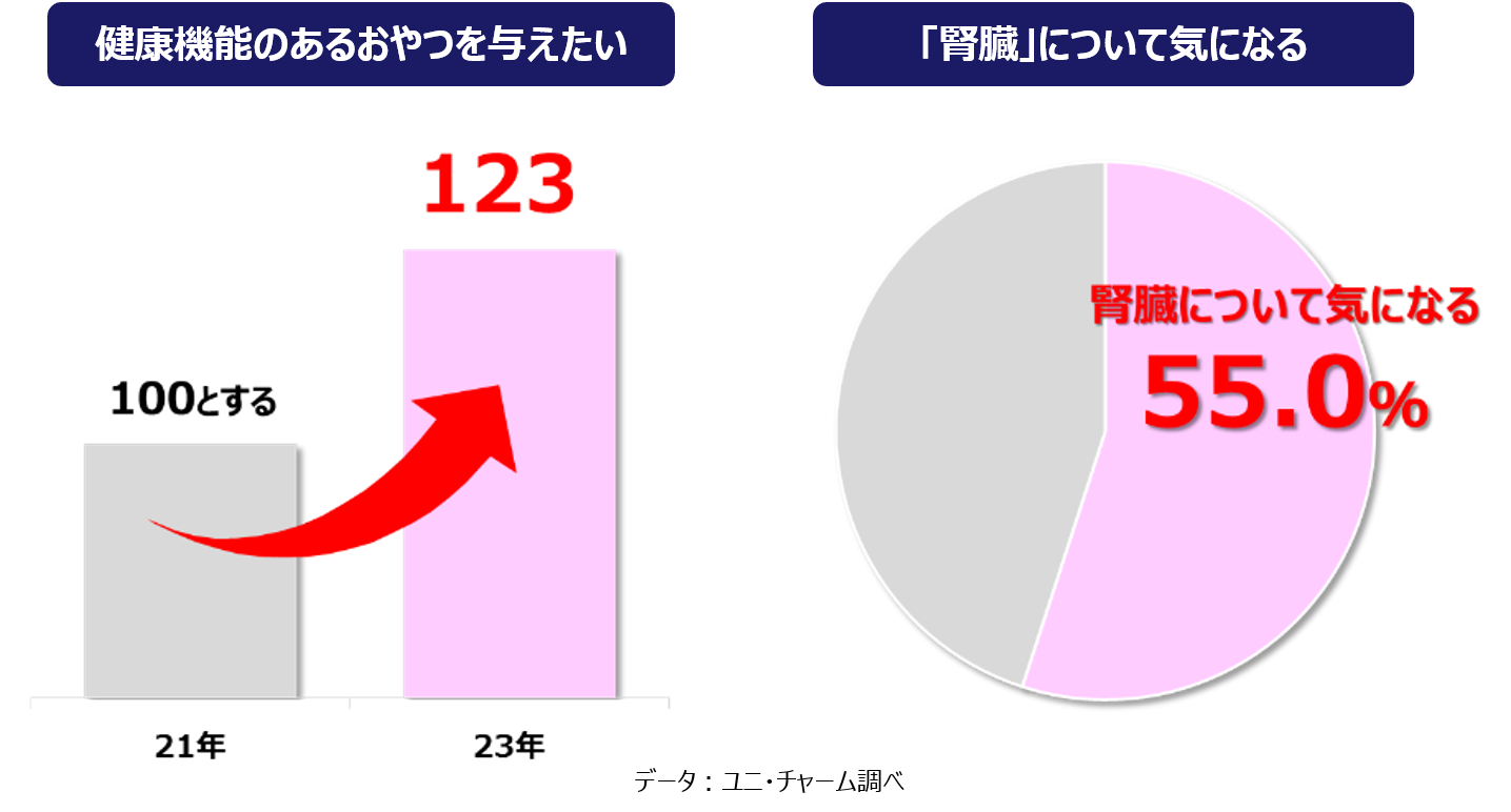 近年、拡大している猫用おやつ市場において、愛猫に対する健康意識が高まり、なかでも「腎臓について気になる」という飼い主様は半数を超えています。