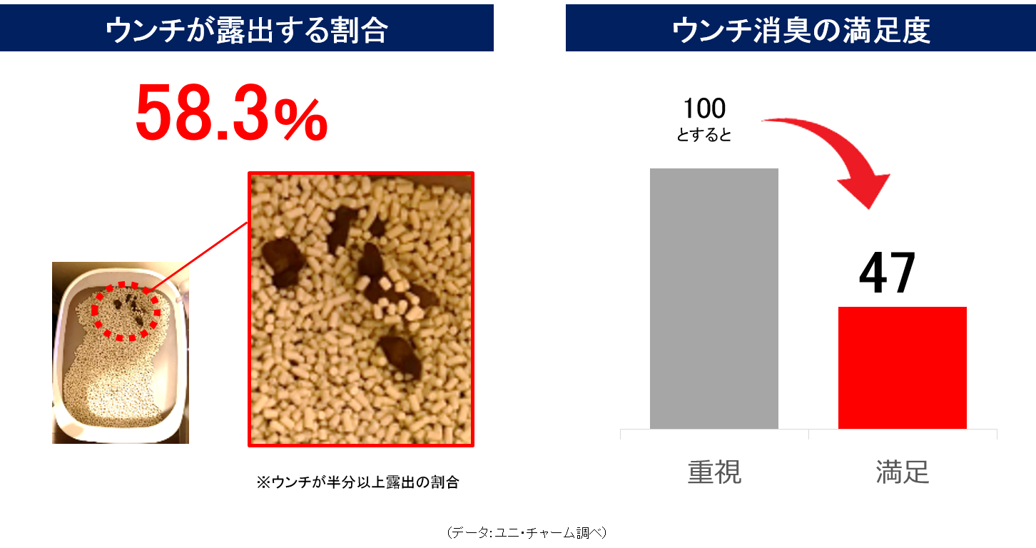 愛猫家は、飼い猫の排泄臭に対処するべく「こまめなお掃除」を心がけていますが、タイムリーに対処できないことも多く、悩みを抱えられています。多くの場合、ウンチは猫砂に覆われずに半分以上露出しており臭いを発し続けます。特に「排泄直後の臭い」は強烈で、愛猫家でも強い嫌悪感を抱くほどです。