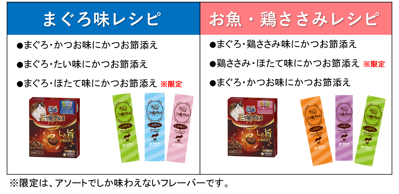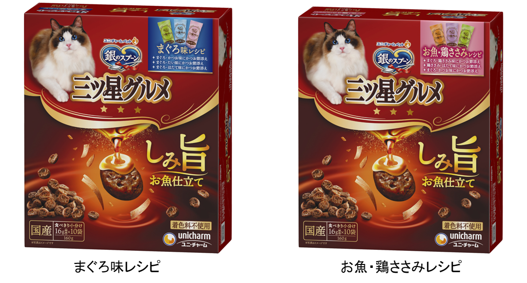 ユニ・チャーム株式会社(代表取締役 社長執行役員:高原 豪久)は、“愛猫には色々な味を食べさせてあげたい”という飼い主様のご要望にお応えし、『銀のスプーン 三ツ星グルメ』しみ旨お魚仕立てから3種のアソートタイプを、2024年3月4日に全国で発売します。