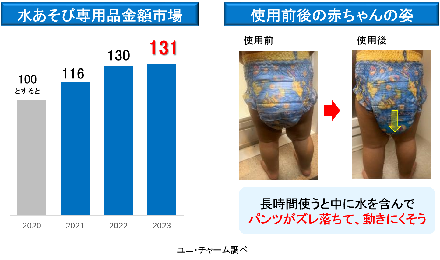 新型コロナウイルス感染症の5類移行に伴って外出機会が増加し、また猛暑などの影響もあり、お子様に「水浴び」をさせる保護者が増加しています。また、保育園や公共のプールでは、水あそび専用の紙パンツの使用を推奨しており、年々市場が拡大しています。