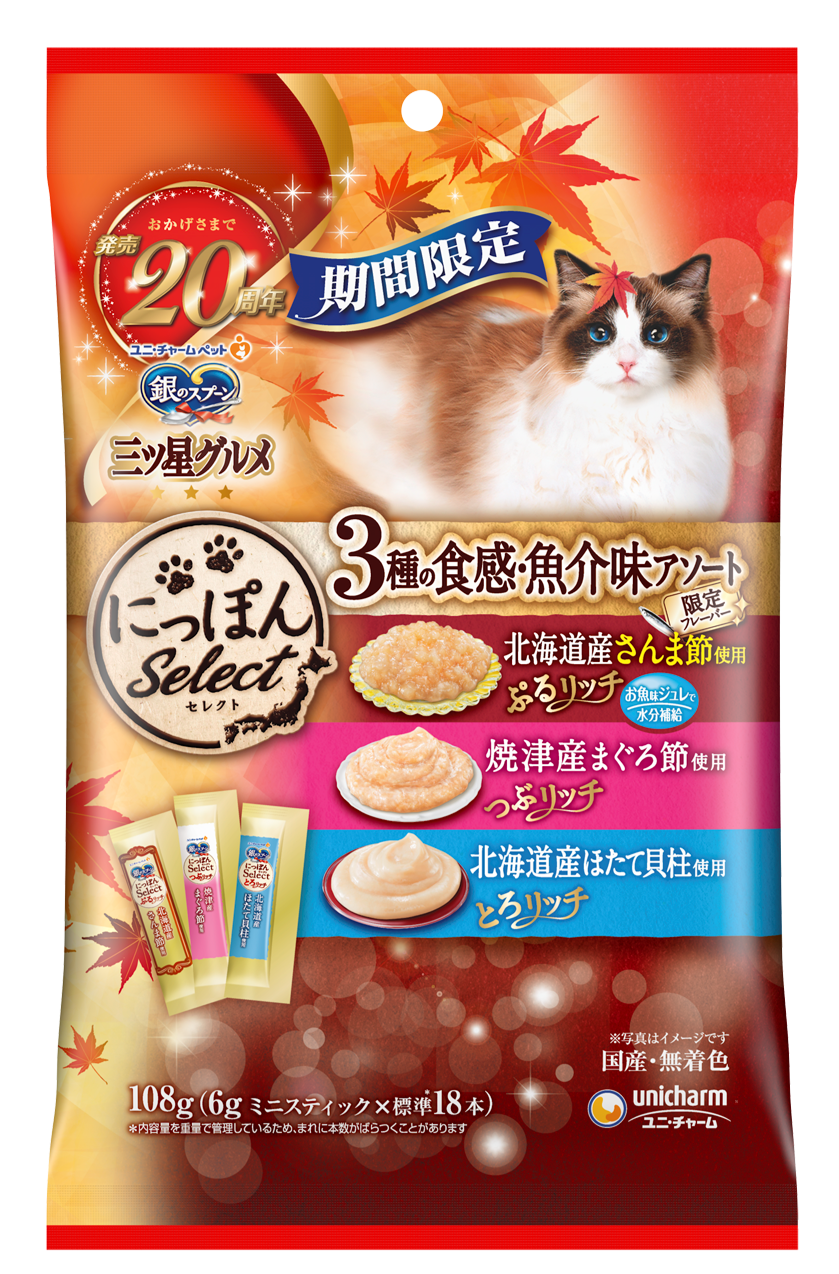 ユニ・チャーム株式会社(代表取締役 社長執行役員:高原 豪久)は、飼い主様の「愛猫にいつもと異なる食感・味を楽しませてあげたい」というご要望にお応えして、『銀のスプーン 三ツ星グルメ にっぽんSelect』から「3種の食感・魚介味アソート」を、2024年8月13日に全国で期間限定品として発売します。