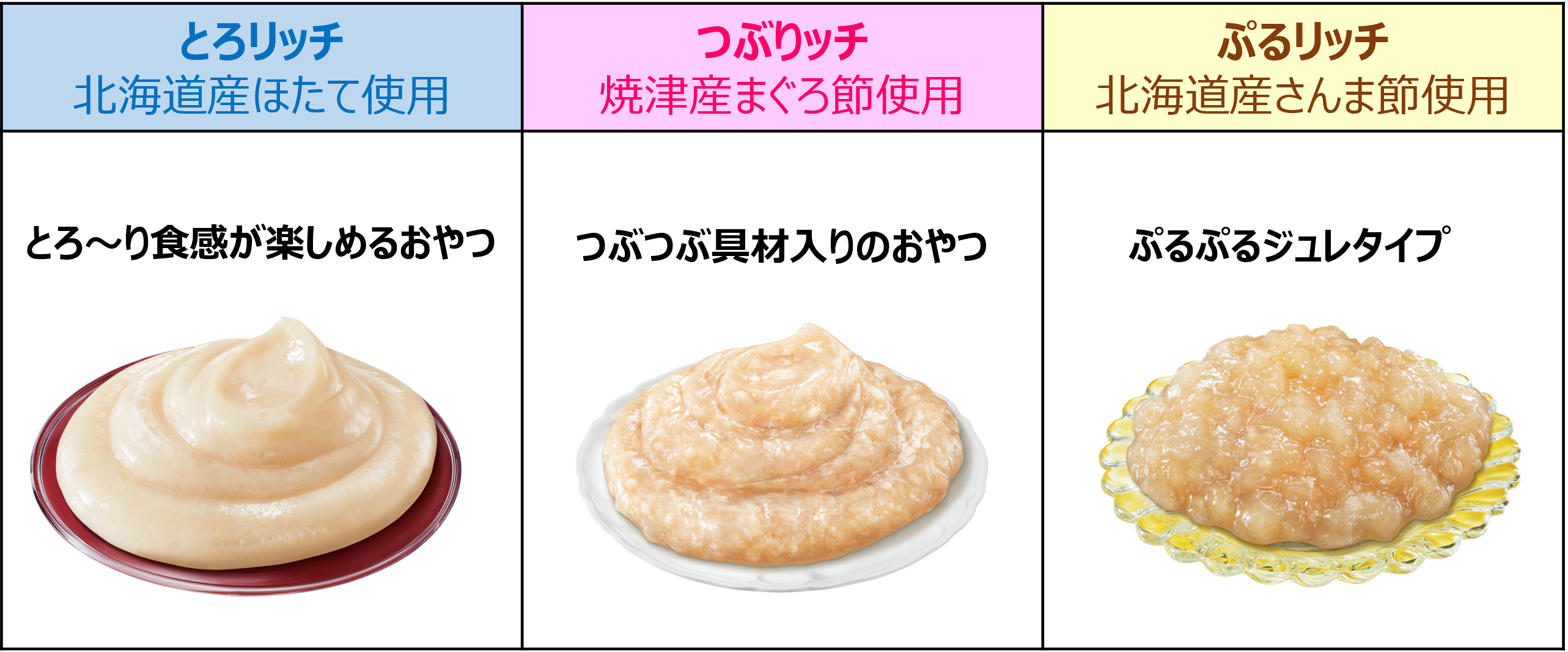 ‐ つぶリッチ: 焼津産のまぐろ節を使用。つぶつぶの具材が入ったおやつです。