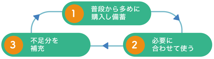 ①→②→③の順で「ローリングストック」を習慣にし、災害時でも使い慣れた商品を使える環境を作りましょう。