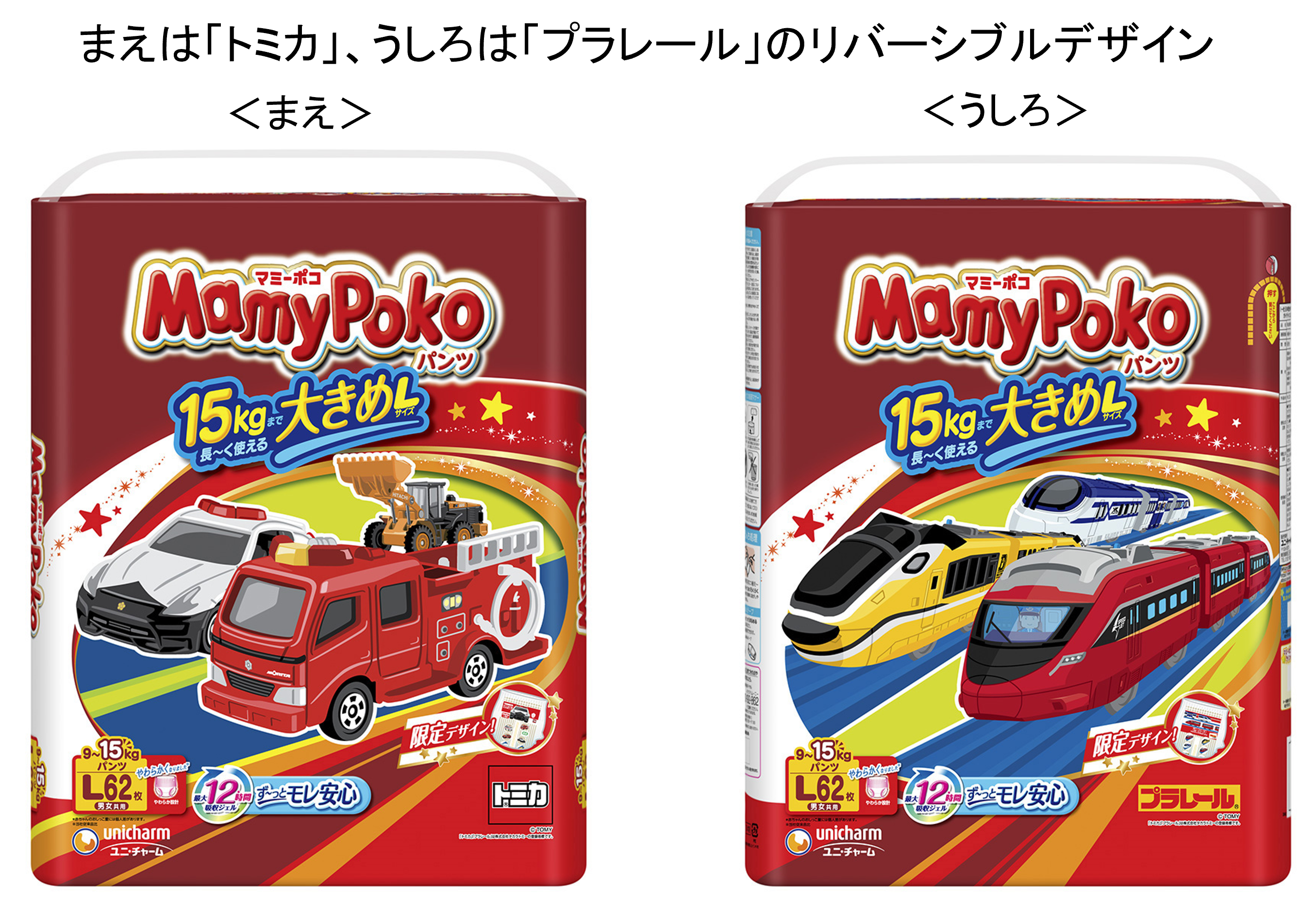 そこでこのたび、お子さまに人気の「トミカ」や「プラレール」のイラストを採用した『マミーポコパンツ』の限定デザインを発売します。