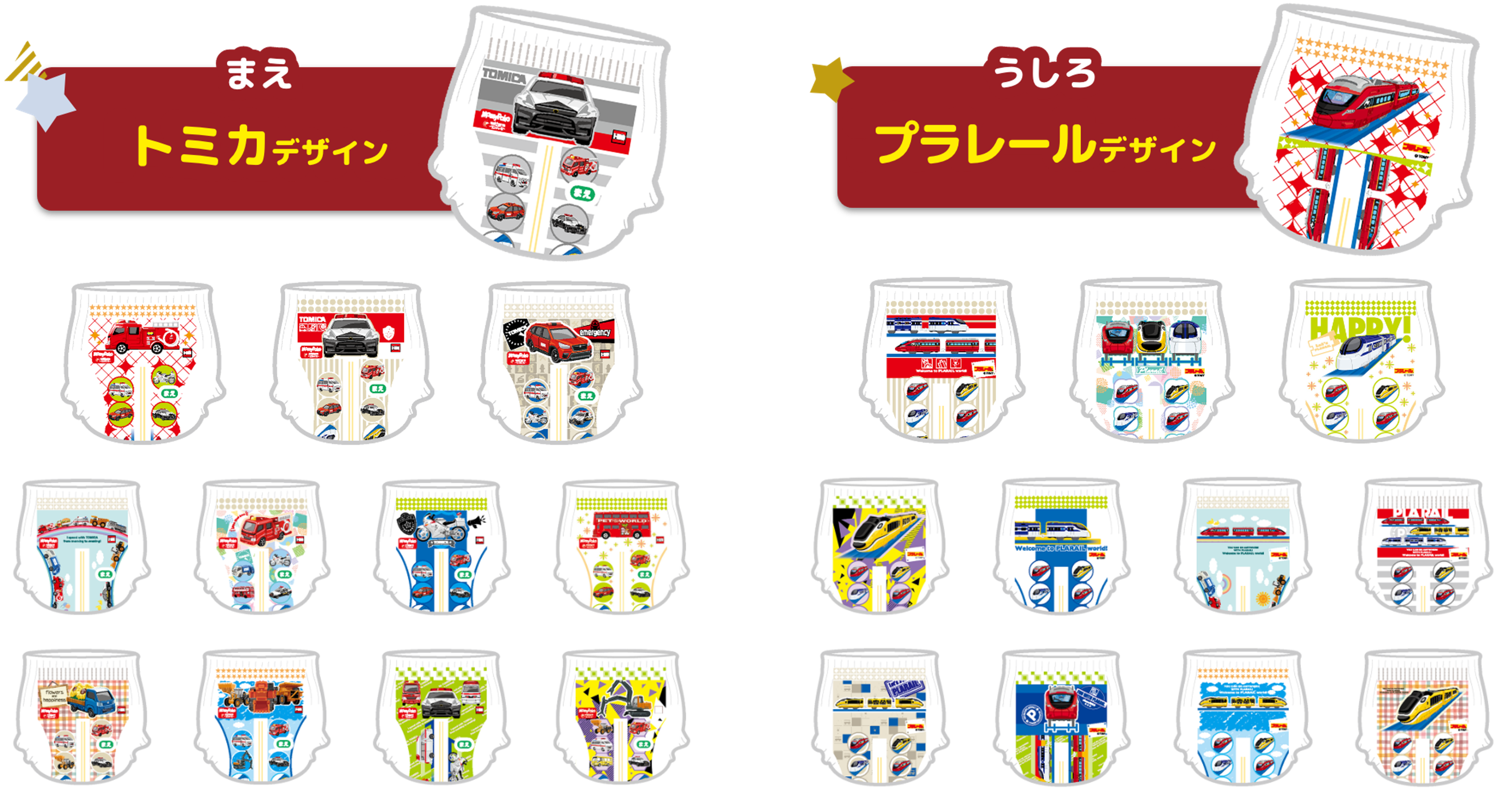・ まえは「トミカ」、うしろには「プラレール」のデザインを採用し、おむつの前後が一目でわかります。