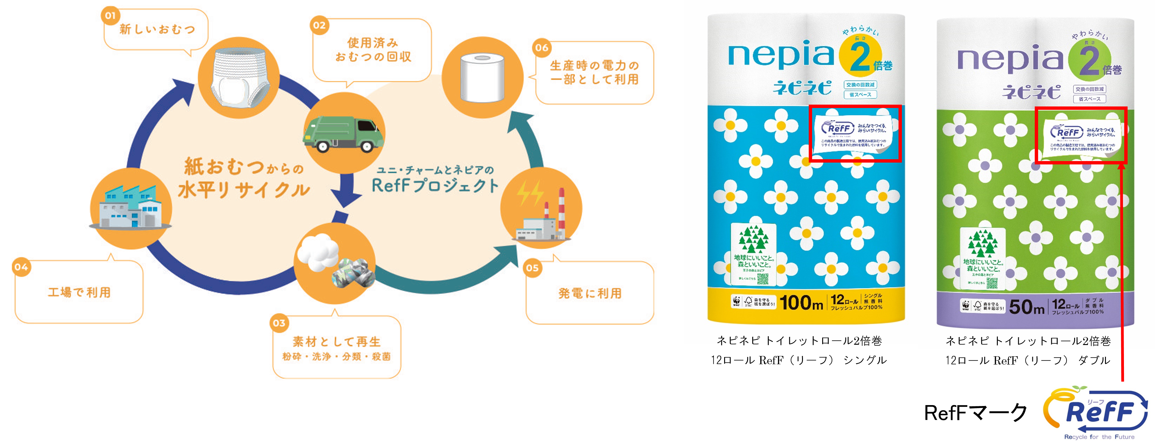 ユニ・チャーム株式会社(代表取締役 社長執行役員:高原 豪久)は、王子ネピア株式会社(本社:東京都中央区、代表取締役社長:森平 高行/以下:王子ネピア)が2024年10月1日より九州エリアで発売する「ネピア ネピネピ トイレットロール2倍巻12ロール RefF シングル/ダブル」の生産において、当社の使用済紙パンツの水平リサイクルプロジェクト「RefF」に参画したことをお知らせします。本商品は、当社が回収した使用済み紙パンツ(紙おむつ)から生成した固形燃料(RPF)から発電した電力を使用して生産されており、パッケージには「RefF」マークが表示されます。