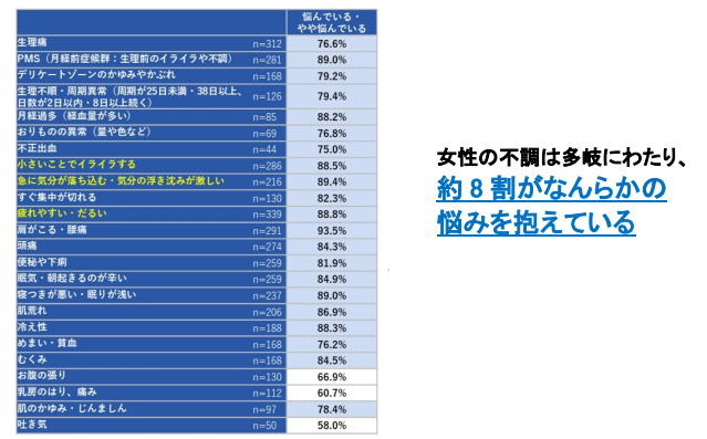 ✓ 女性の不調は多岐にわたり、約8割の人が悩みを抱えている。