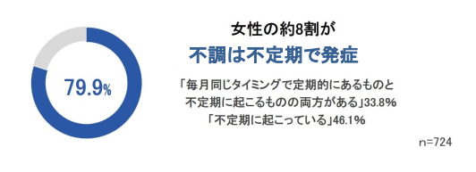 不調は毎月同じタイミングで定期的に起こっているかを尋ねたところ、「毎月同じタイミングで定期的にあるものと不定期に起こるものの両方がある」と答えた女性が33.8%、「不定期に起こっている」と答えた女性が46.1%という結果となり、約80%の女性が不定期的な不調を経験していることがわかりました。