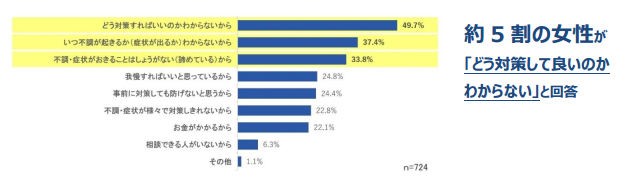 また、症状が現れてからの対策についても、約6割の女性が対策できていないと回答し、不調の改善に向き合えていないことがわかりました。