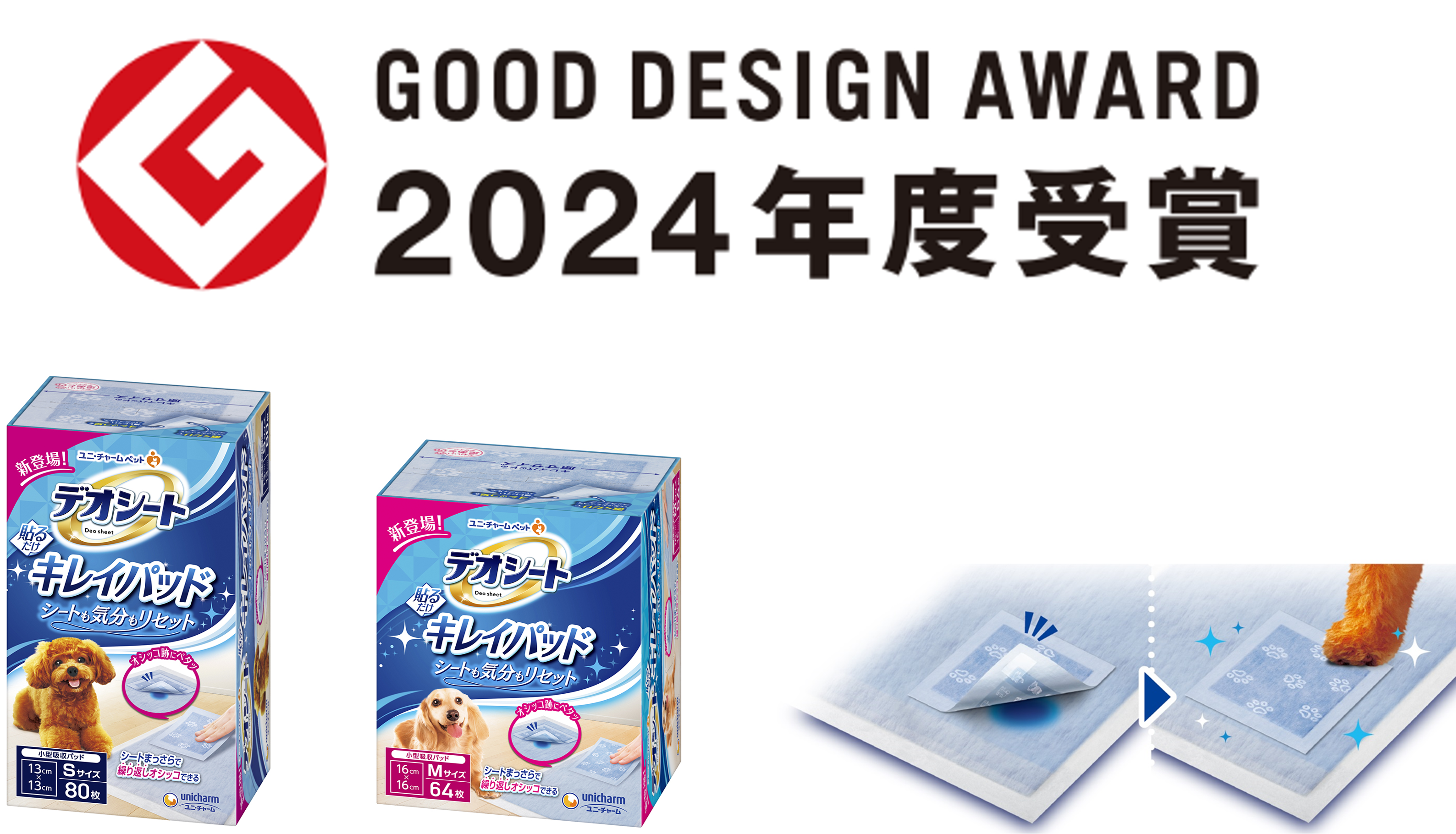 ユニ・チャーム株式会社(代表取締役 社長執行役員:高原 豪久)の『デオシート キレイパッド』が、2024年度グッドデザイン賞(主催:公益財団法人日本デザイン振興会)を受賞したことをお知らせいたします。『デオシート キレイパッド』は、ワンちゃんのオシッコ跡にペタッと貼るだけでシートを丸ごと交換する必要がなく、その利便性はもとよりゴミ削減等にも貢献する商品です。