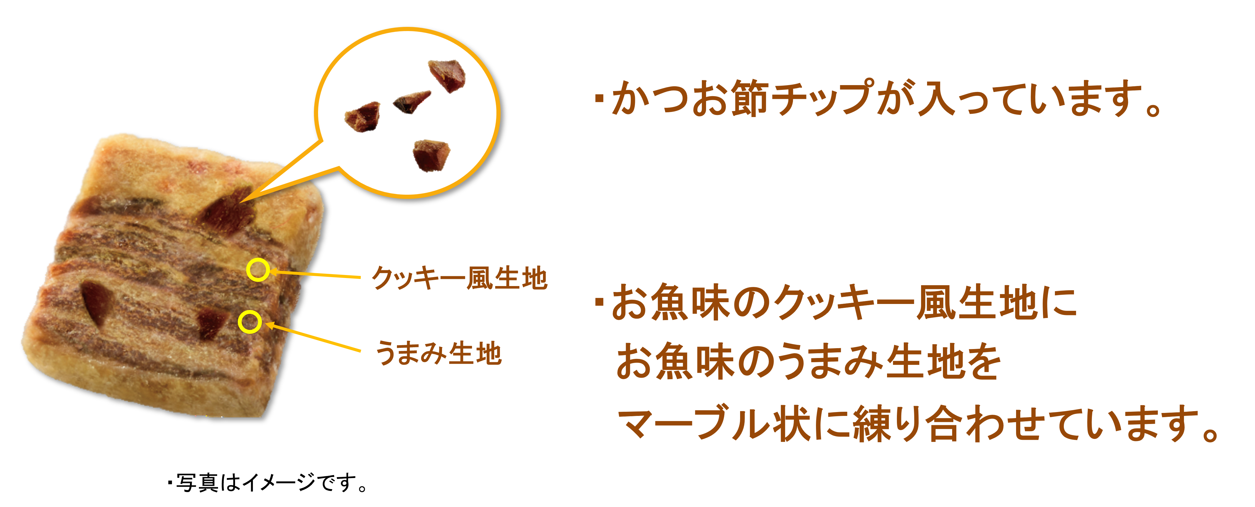 1.かつお節チップ入りで、お魚味とうまみを練りこんだクッキー風生地のおやつです。