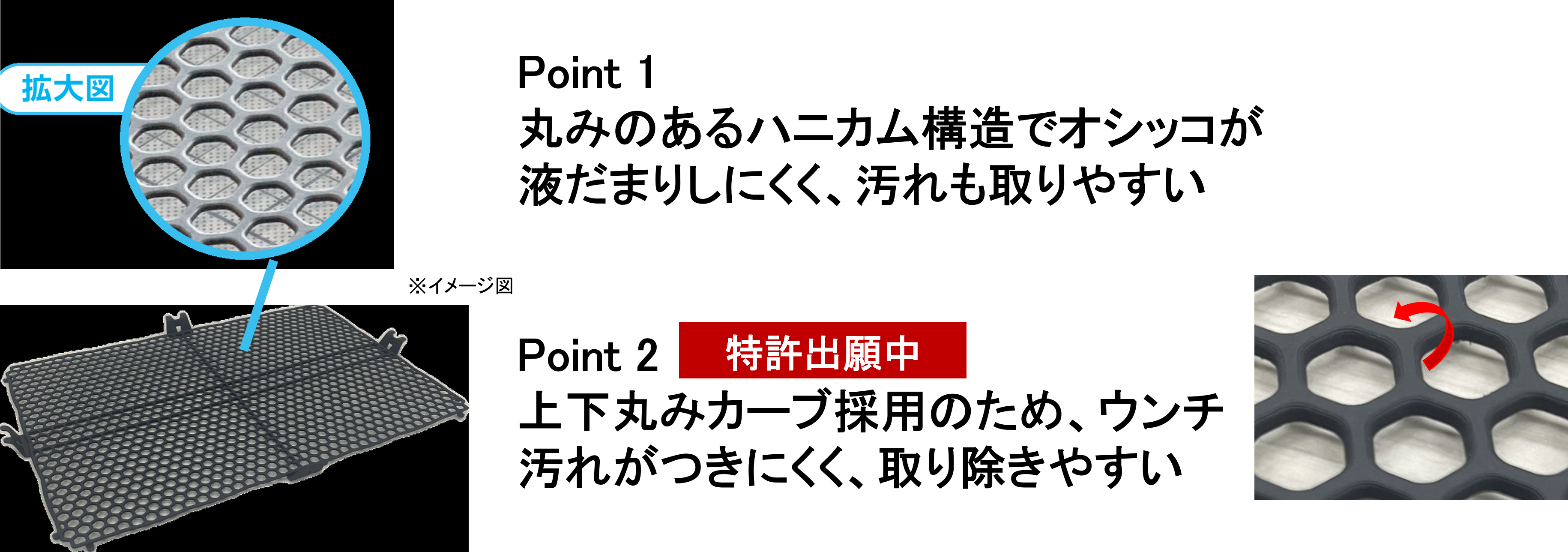 ・オシッコの液だまりを防ぎ、汚れを取り除きやすい丸みを帯びたハニカム構造です。