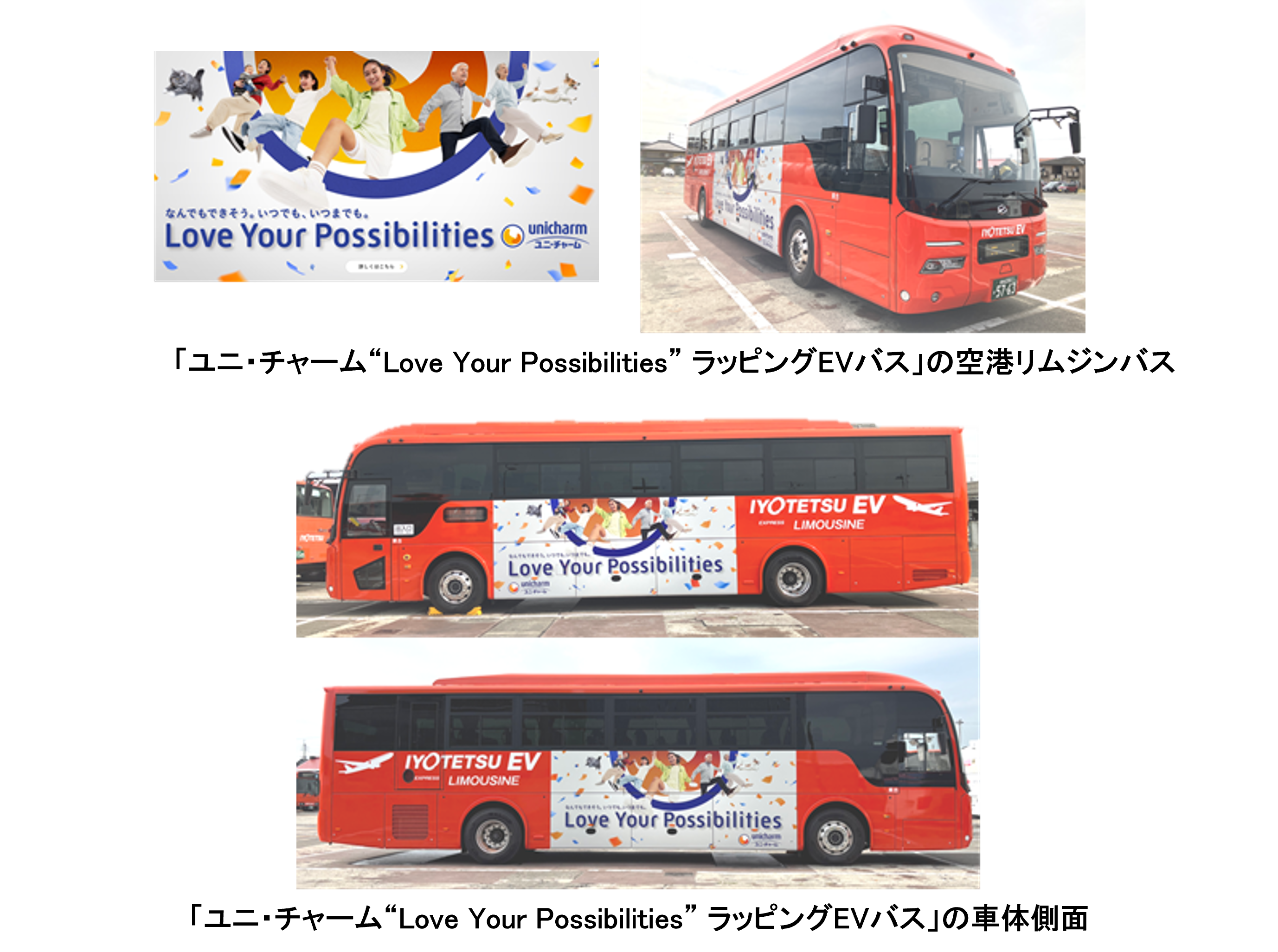 ユニ・チャーム株式会社(代表取締役 社長執行役員:高原 豪久)は、株式会社伊予鉄グループ(代表取締役社長:清水 一郎)と協業し、地域活性化と省エネルギー化による持続可能な社会の実現を目的とした「ユニ・チャーム“Love Your Possibilities” ラッピングEVバス」の運行を、2025年6月1日に開始することをお知らせします。