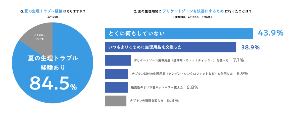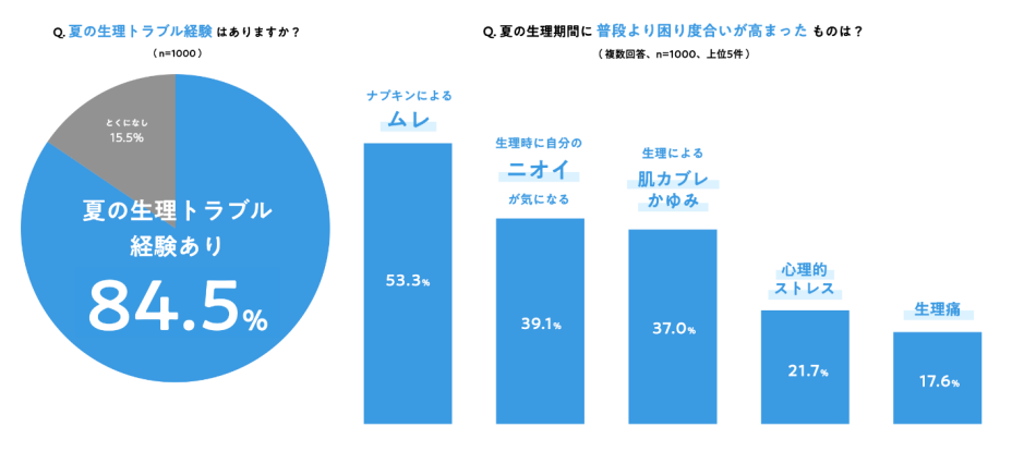 ① 84.5%の女性が「夏の生理トラブルを経験したことがある」と回答