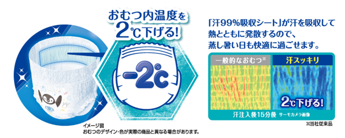 ・紙パンツの外へ熱を発散することで、紙パンツ内の温度を最大2℃※5下げます。