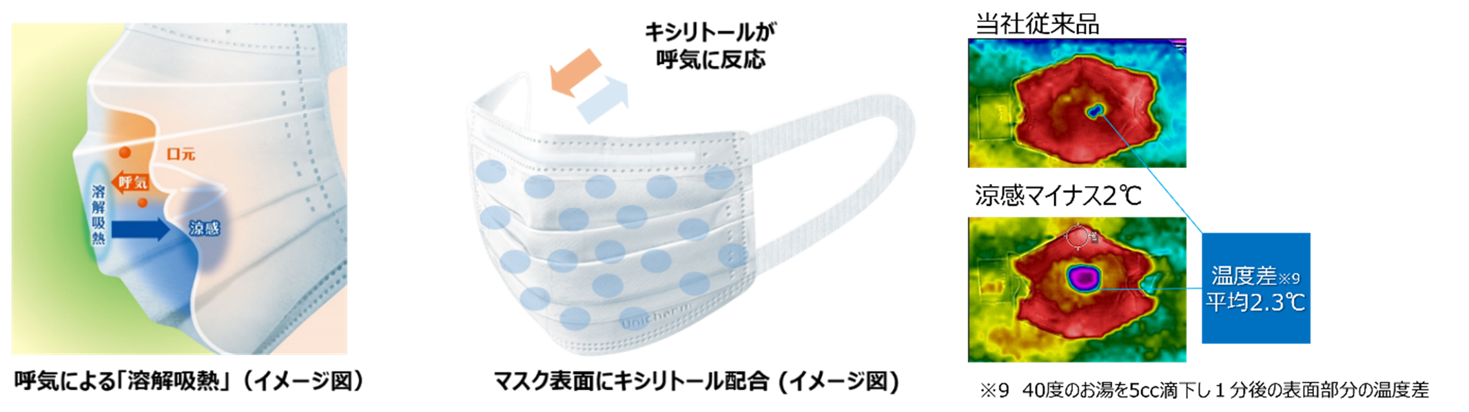 ・ 不織布に配合されたキシリトールが呼気に含まれる水分に反応し、マスクの表面の温度を低下させます。※7