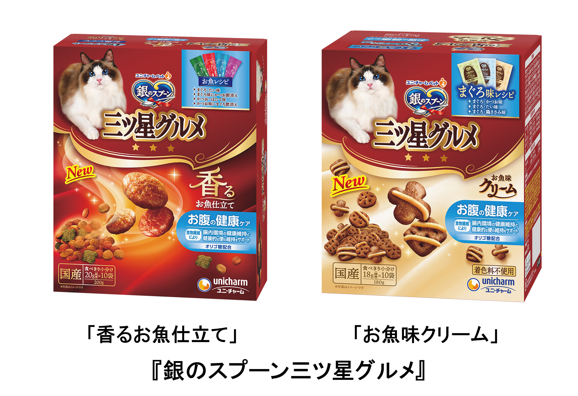 そこでこのたび、そうしたニーズにお応えし『銀のスプーン三ツ星グルメ』から「お腹の健康ケア※1」タイプとして、『銀のスプーン三ツ星グルメ 香るお魚仕立て』と『銀のスプーン三ツ星グルメ お魚クリーム』を発売します。