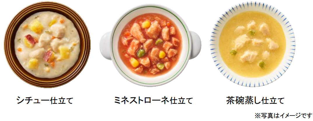 そこでこのたび、『グラン・デリ おかず仕立てパウチ』から「シチュー仕立て」「ミネストローネ仕立て」「茶碗蒸し仕立て」の3種類の新メニューを発売することとしました。
