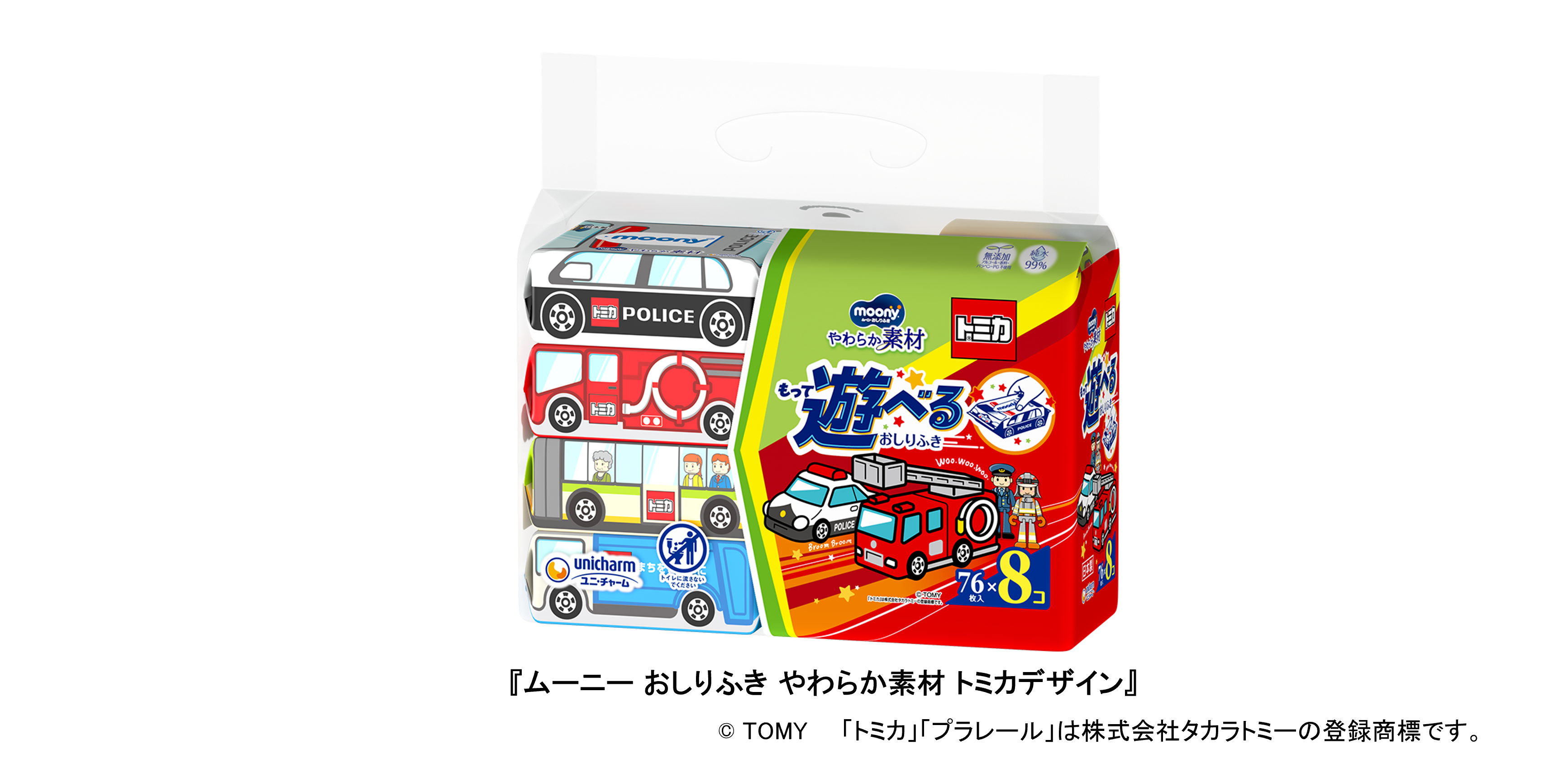 そこでこのたび、3世代にわたり愛される「トミカ」とコラボレーションした『ムーニー おしりふき やわらか素材 トミカデザイン』を全国で発売します。