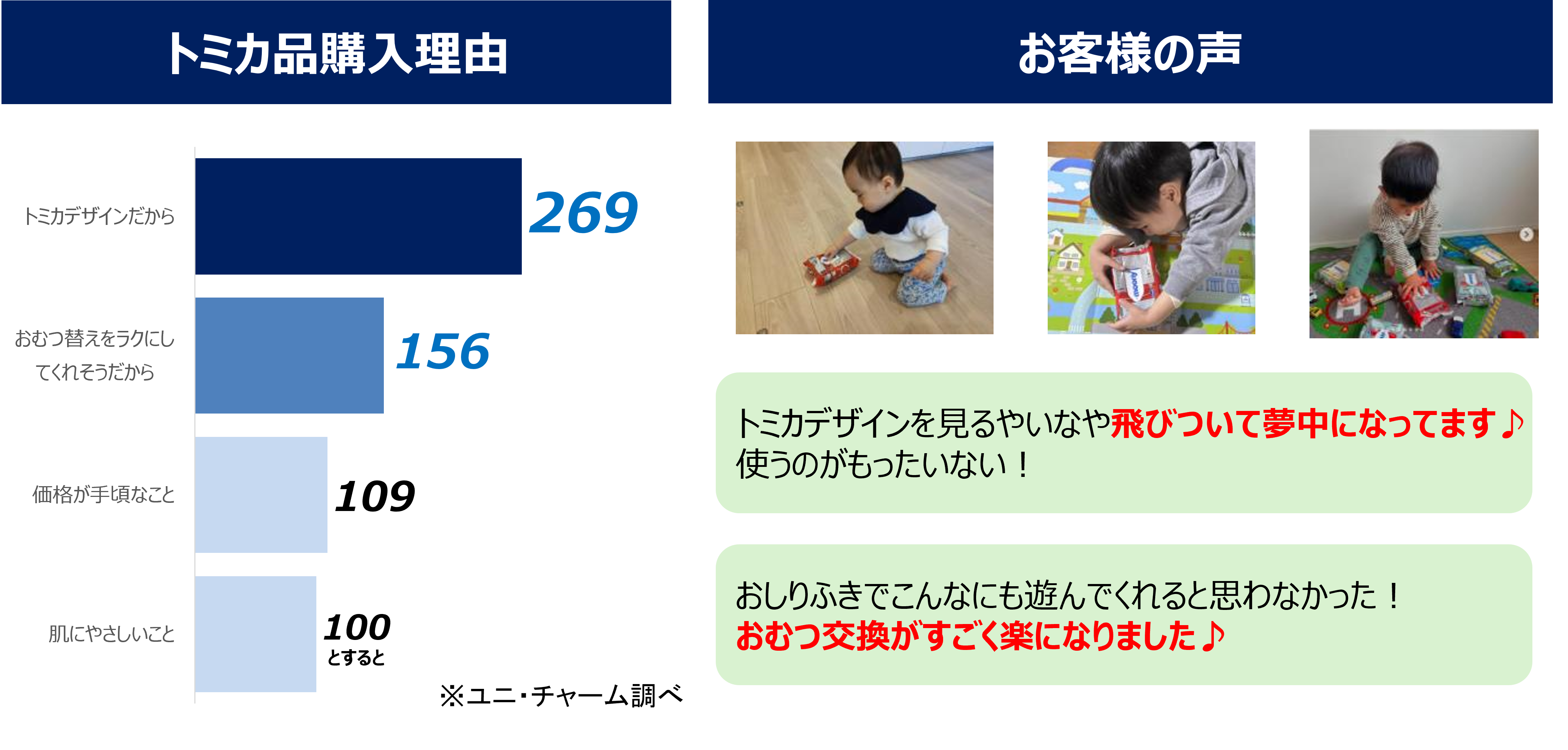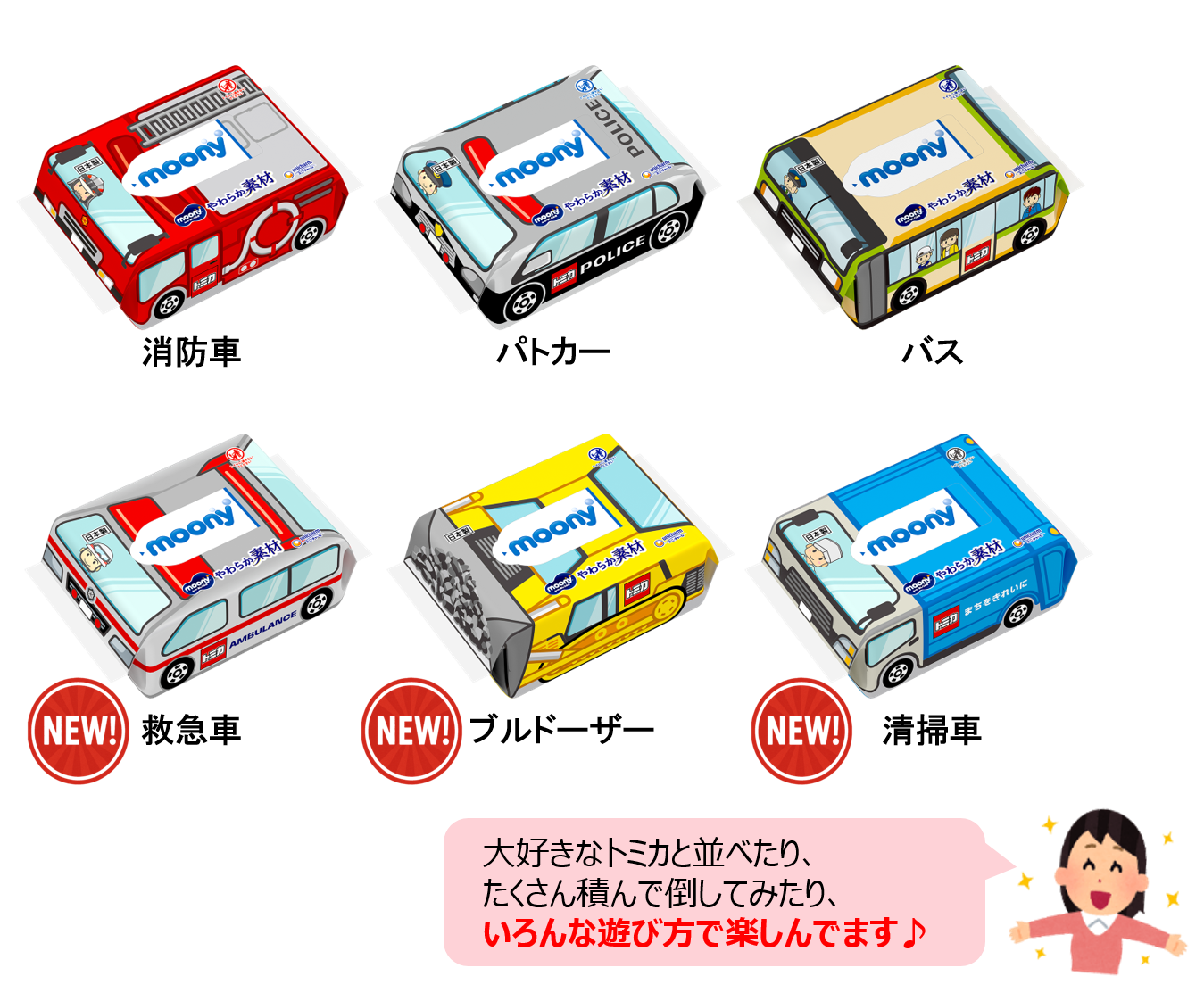 これまでも、「トミカ」とコラボレーションした限定品を発売し、「子どもがトミカ好きなので喜んで使ってくれる」「おむつ替えの際に遊んでくれるので助かる」といった満足の声を数多くいただいてきました。