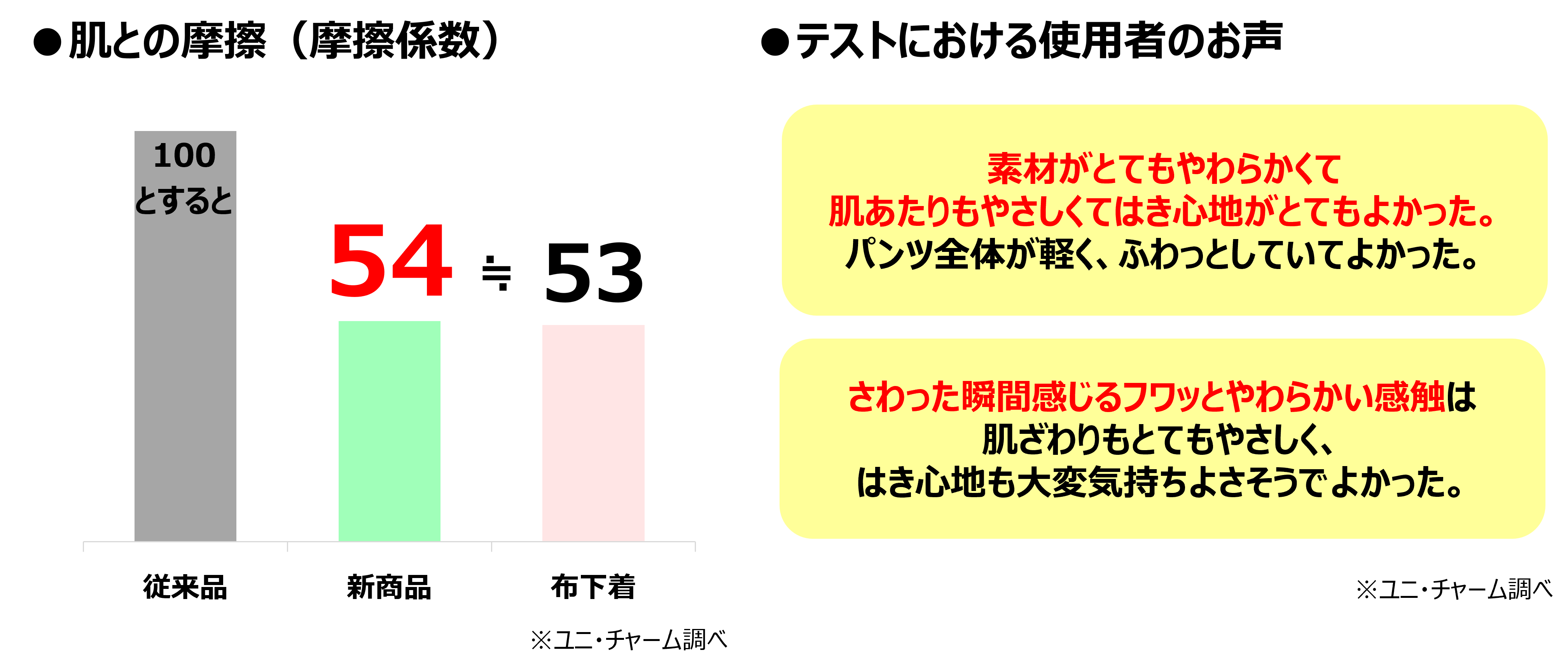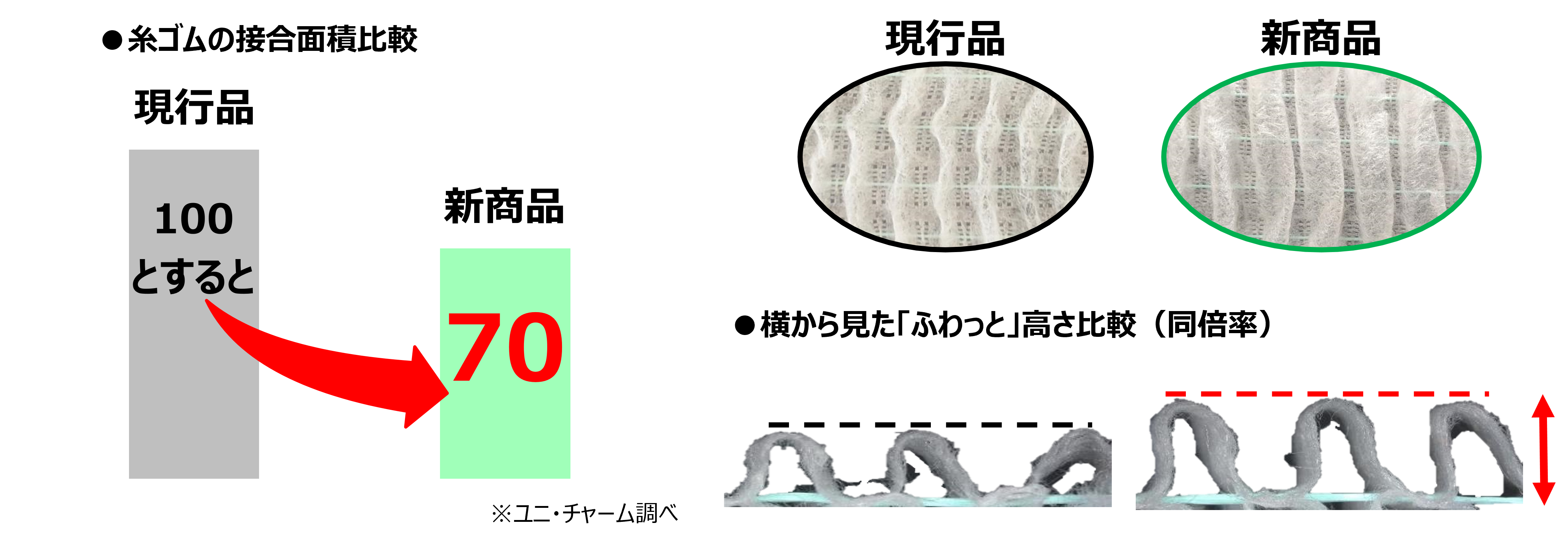 ・硬くなりやすい糸ゴムの接合面積を減らすことで、やわらかさを感じる範囲が広がりました。