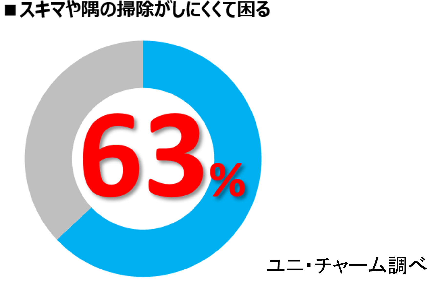 ライフスタイルの多様化に伴い、掃除にも「タイパ(タイムパフォーマンス)※1」が求められています。特に毎日の生活の中で発生する細かな汚れを手間なく、短時間で掃除したいというニーズも年々高まっています。当社の調査では、トイレ・洗濯機のまわりのスキマや階段の隅など、掃除機や従来のフロアワイパーでは届きにくい“家中のあらゆるスキマや隅”の掃除に困っている方が6割以上にのぼることが明らかになりました。