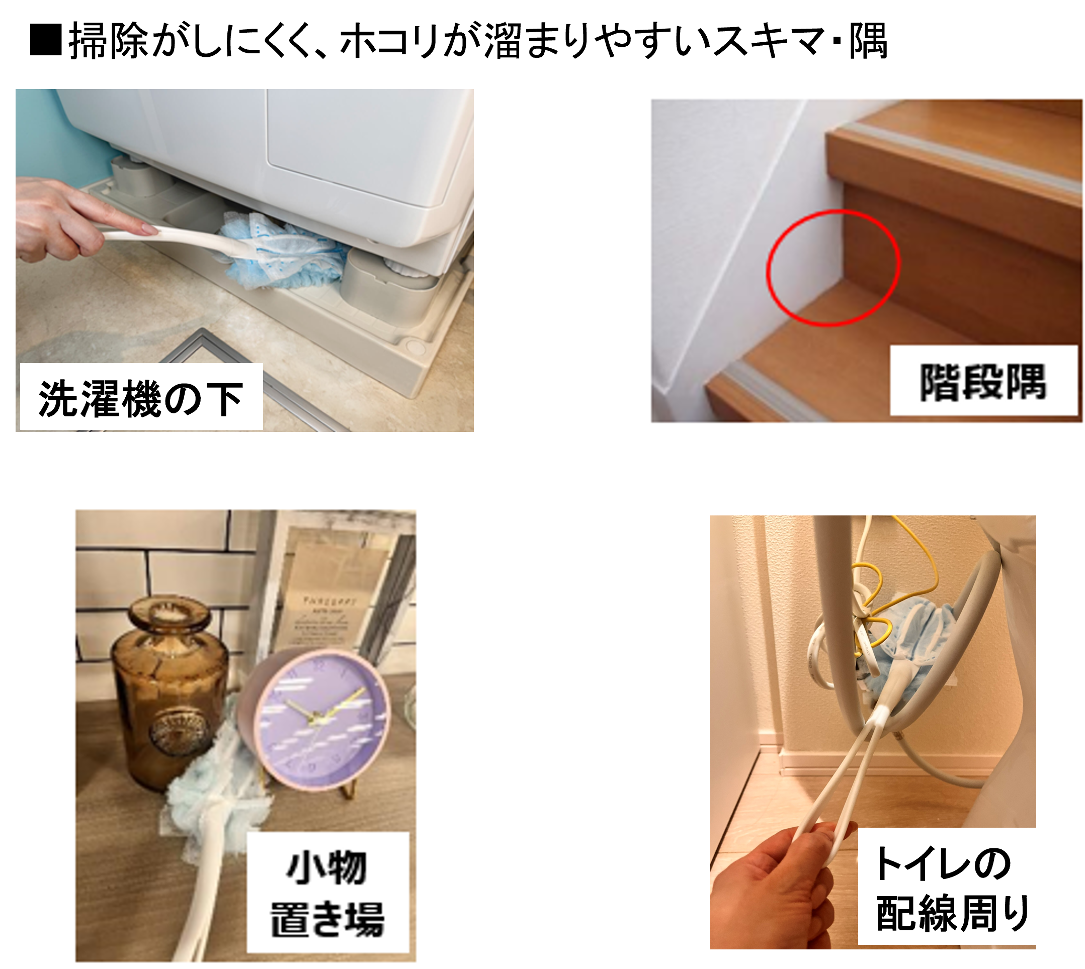 ・テレビ台などの広い面はもちろん、トイレの配線周りや階段の隅、小物の細かなスキマといった手の届きにくい場所にも対応。