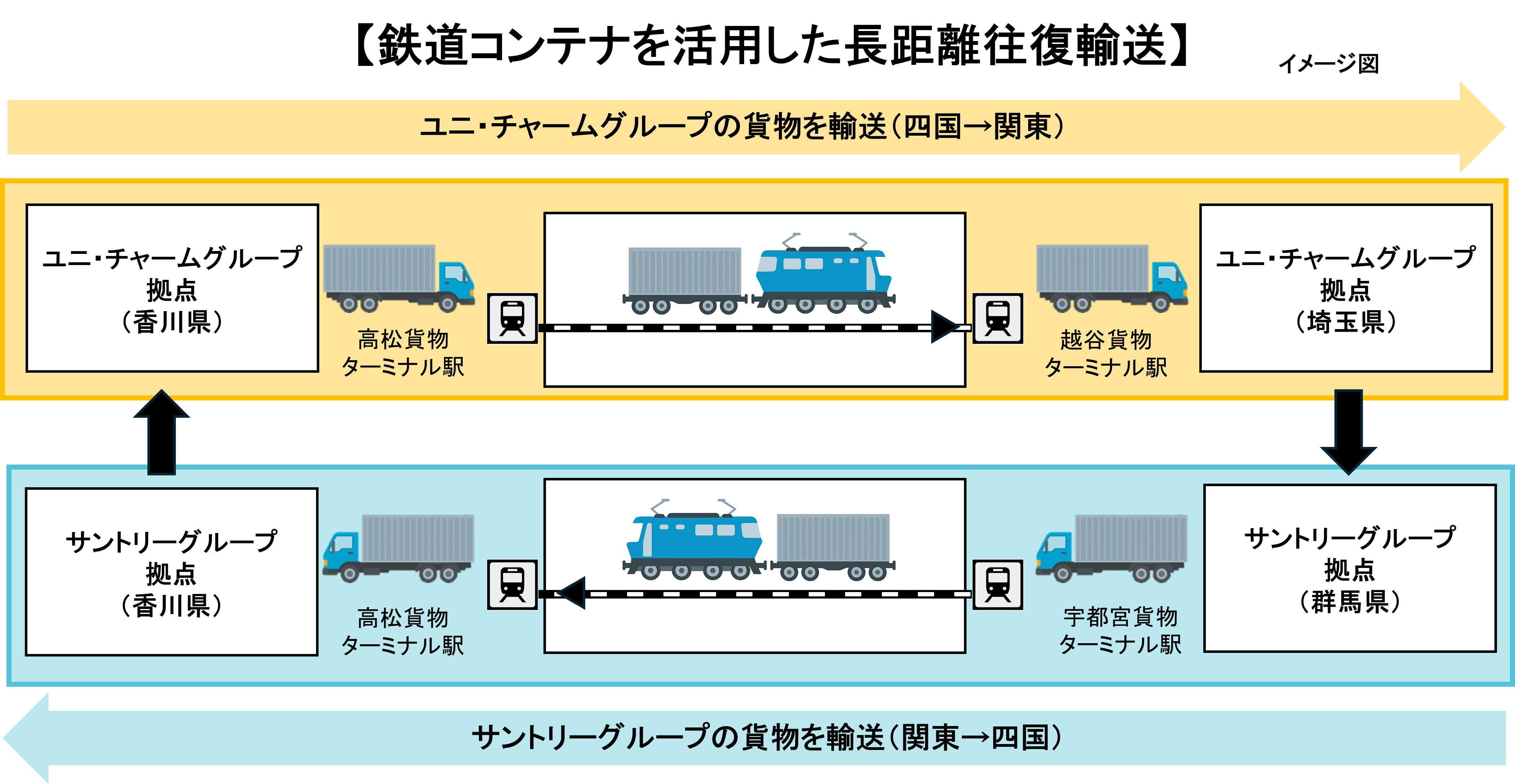 ユニ・チャーム株式会社(代表取締役 社長執行役員:高原 豪久)の生産子会社であるユニ・チャームプロダクツ株式会社は、サントリーグループ(以下、サントリー)と共同で、関東・四国間の鉄道コンテナによる長距離往復輸送を、2025年11月より本格稼働することをお知らせします。