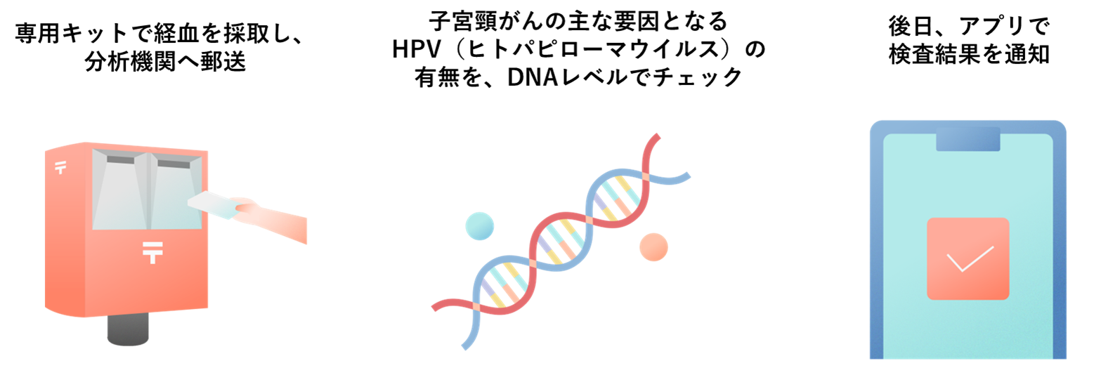 上記の流れにより、自宅にいながら簡単に婦人科疾患リスクに関する検査※2が行える専用キットです。