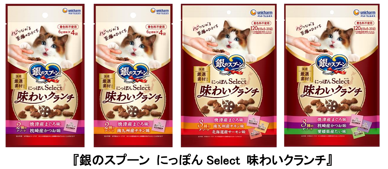 ユニ・チャーム株式会社(代表取締役 社長執行役員:高原 豪久)は、猫用おやつブランド「銀のスプーン」より、日本各地の厳選素材を使用し、着色料不使用で仕上げたドライタイプおやつ『銀のスプーン にっぽんSelect 味わいクランチ』を、2026年3月3日に全国で発売します。