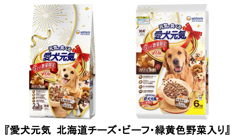 ユニ・チャーム株式会社(代表取締役 社長執行役員:高原 豪久)は、1986年の発売以来、長年にわたりご愛顧いただいているドッグフードブランド『愛犬元気』の発売40周年を記念し、厳選素材を使用した特別フレーバーとして『愛犬元気 北海道チーズ・ビーフ・緑黄色野菜入り』を、2026年3月3日に期間限定品として全国で発売します。