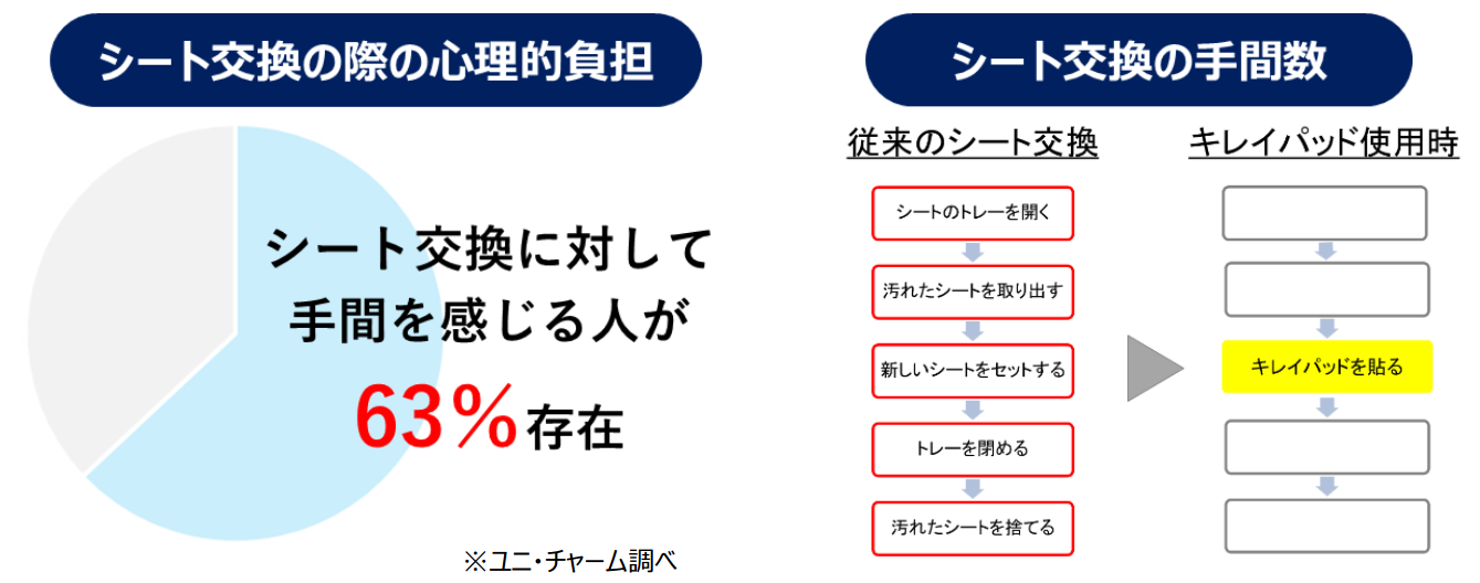 こうしたシート交換の手間を軽減するため、2024年に『デオシート キレイパッド』として発売したところ、お客様から「貼るだけでシートをまるごと交換しなくて便利、まさにこんな商品がほしかった」という高い評価をいただきました。そこでこのたび、「ペタッと貼るだけで、まるごと交換の手間をなくす」という簡便性と機能性をより直感的に伝えるため、商品名称を『デオシート 貼るだけキレイパッド』に刷新します。