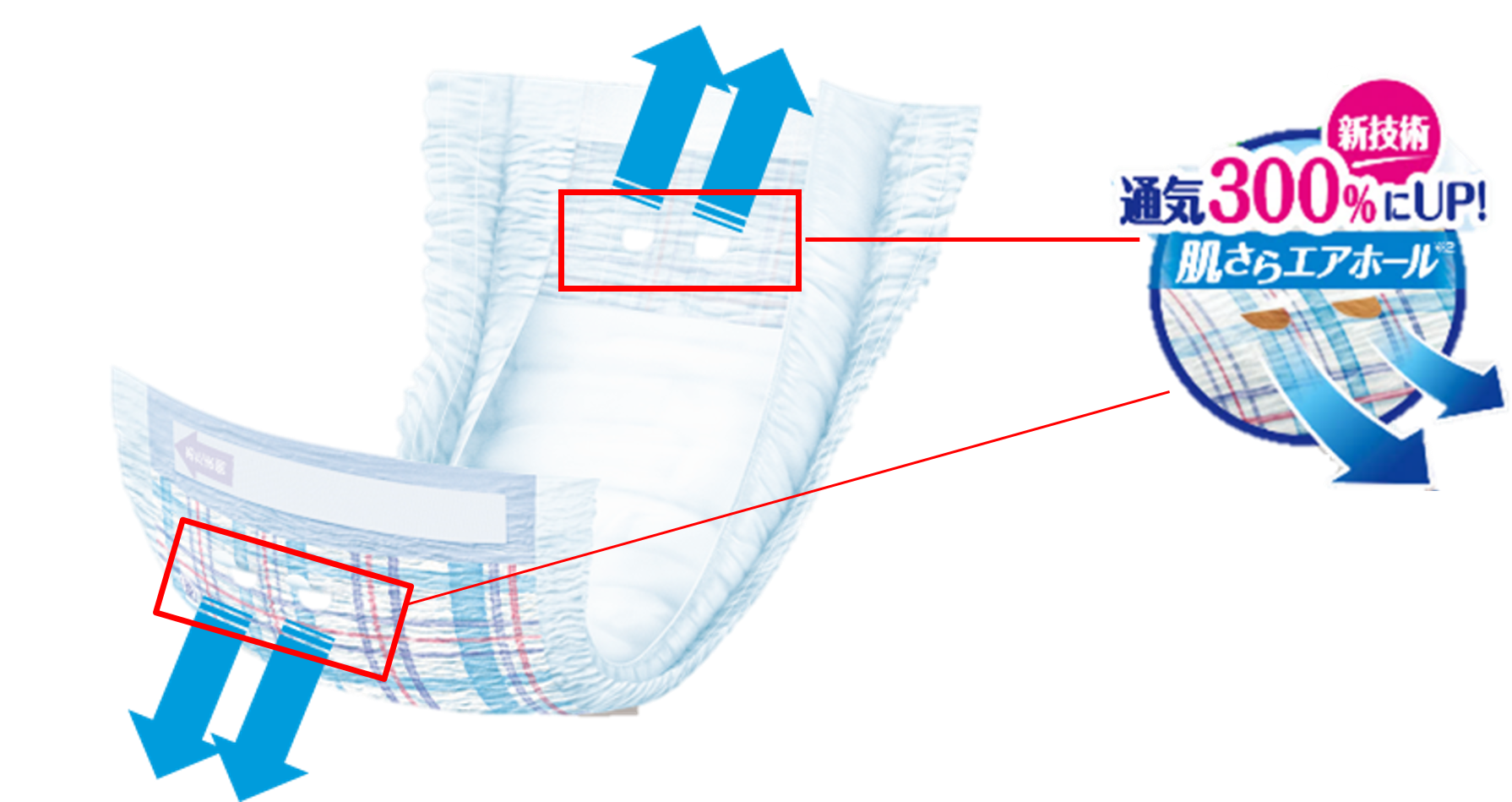 ①通気性を300%※1に向上させる独自の「肌さらエアホール」を新搭載※2
