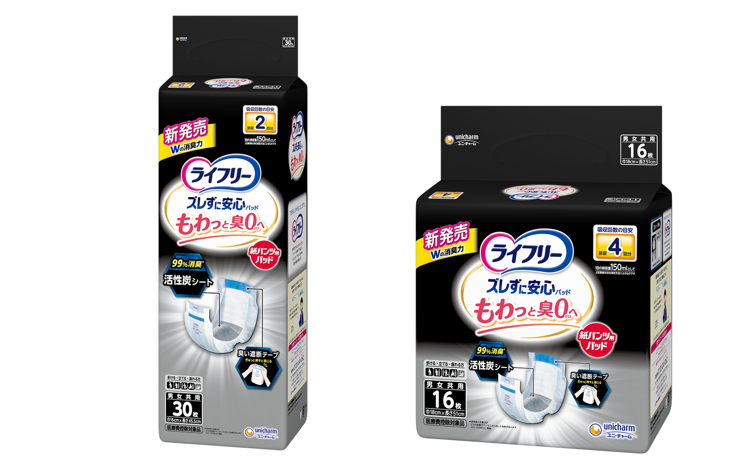 そこでこのたび、世界初※1の「臭い遮断テープ」と尿の臭気成分を抑制する「99%消臭※2活性炭シート」を搭載した『ライフリー ズレずに安心消臭紙パンツ専用尿とりパッド』を発売します。