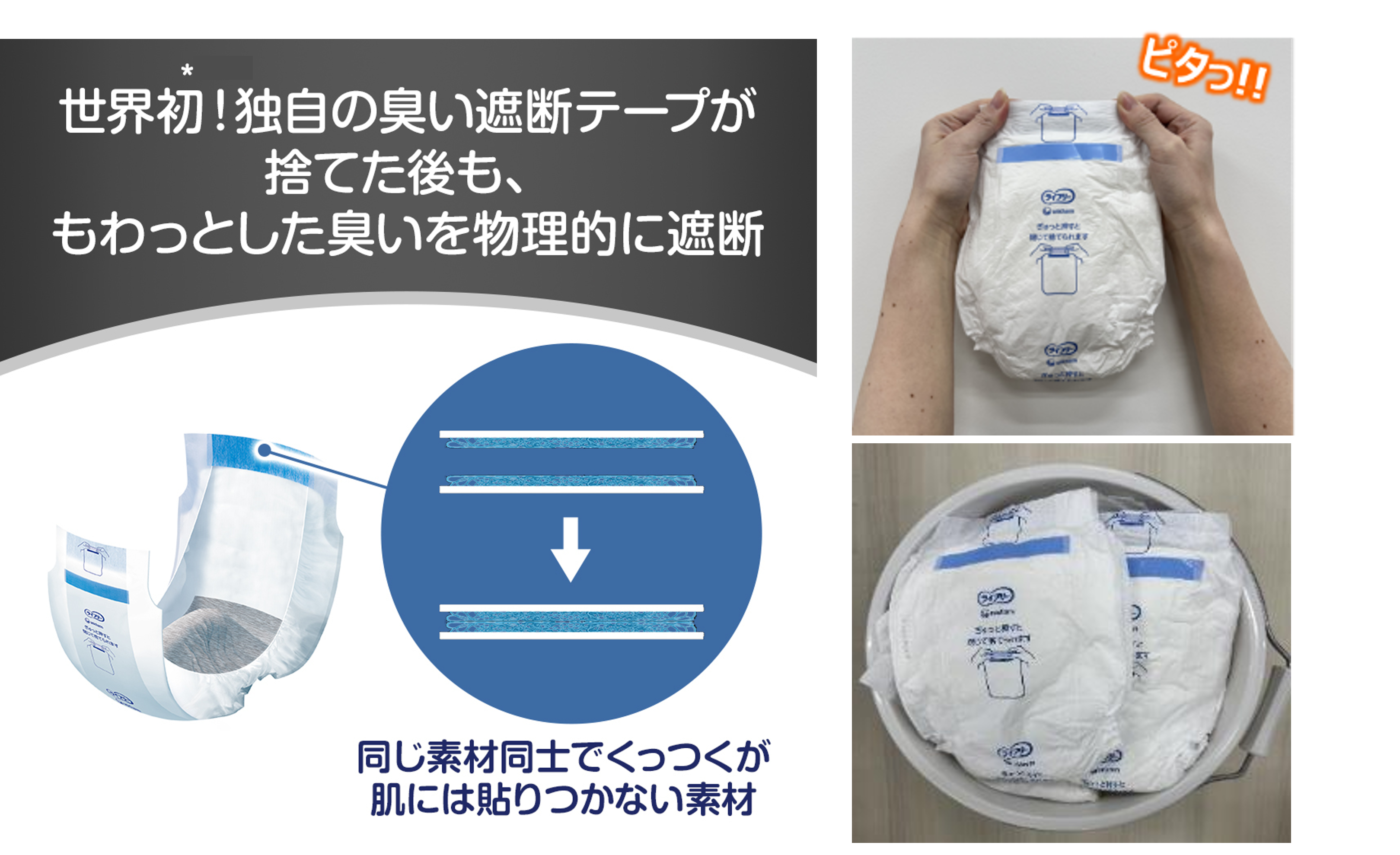 内側のテープが2つ折りのままピタッと密着し、ごみ箱などへの廃棄後もニオイの広がりを防ぎます。