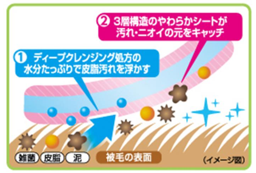 ・やわらかな3層構造シートが、夏のベタつく皮脂汚れやニオイの元、被毛についた泥などをしっかり拭き取り、清潔に保ちます。