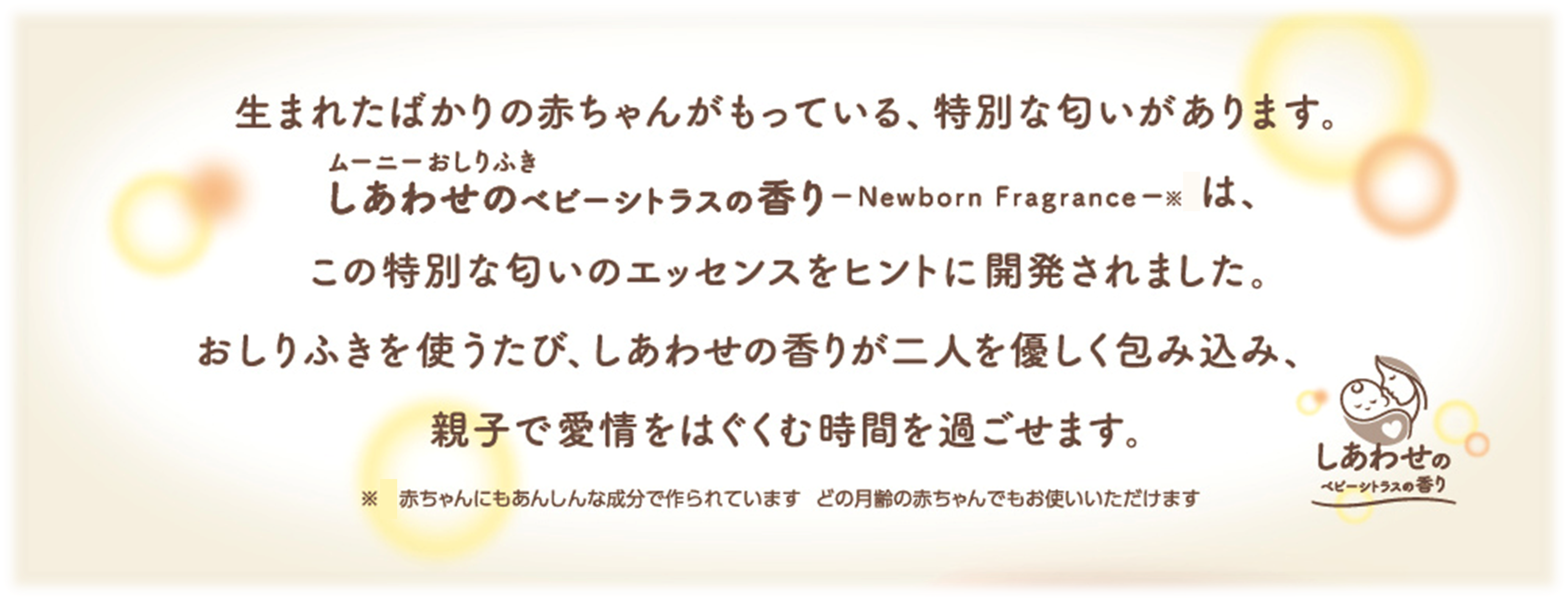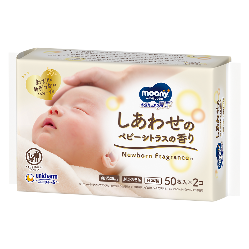 そこでこのたび、親子で愛情をはぐくむ時間をより豊かなものにすることを目指し、「新生児だけの特別な香り」を配合した『ムーニーおしりふき しあわせのベビーシトラスの香り』を、全国で発売します。