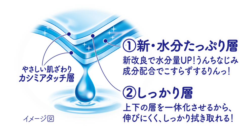 ・「新・水分たっぷり層」により、こすらずにやさしい拭き取りを実現します。