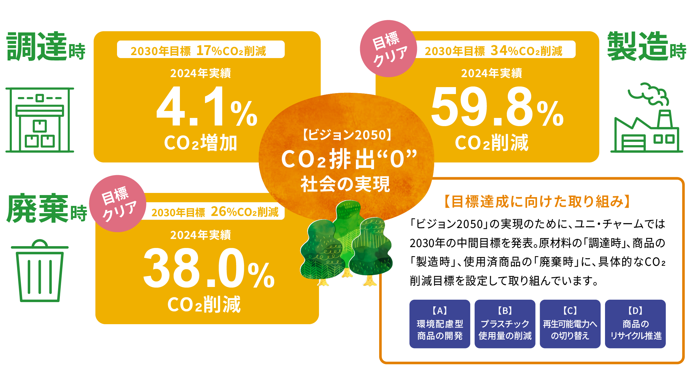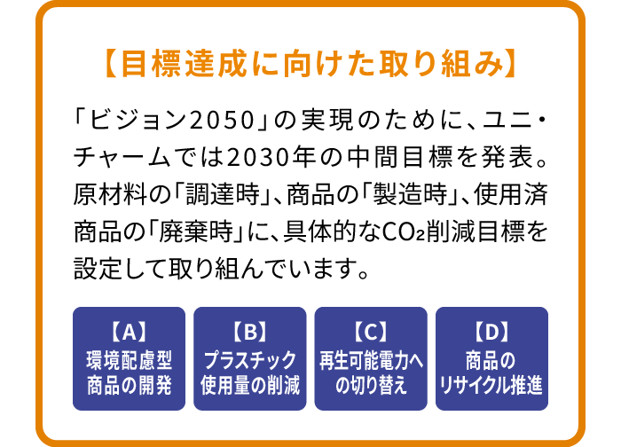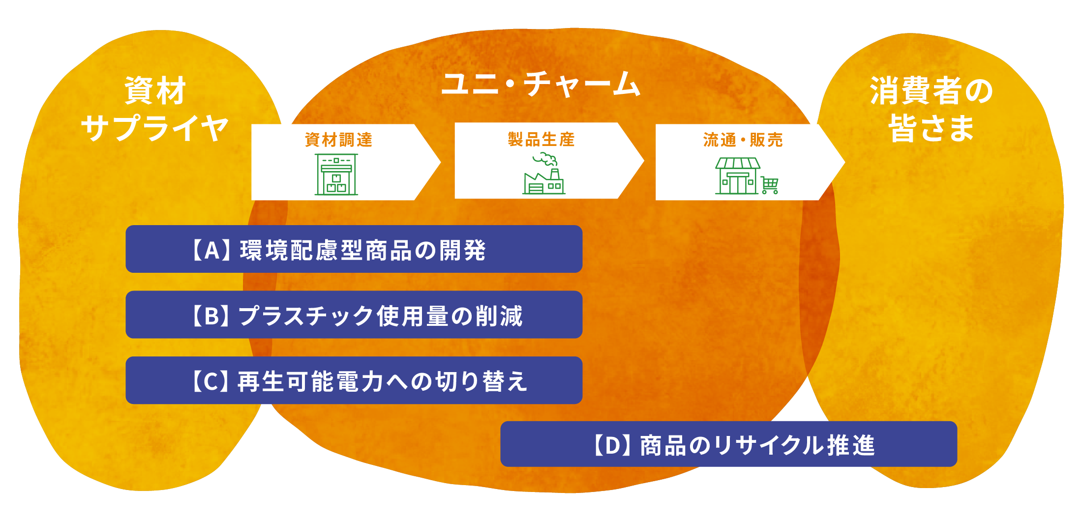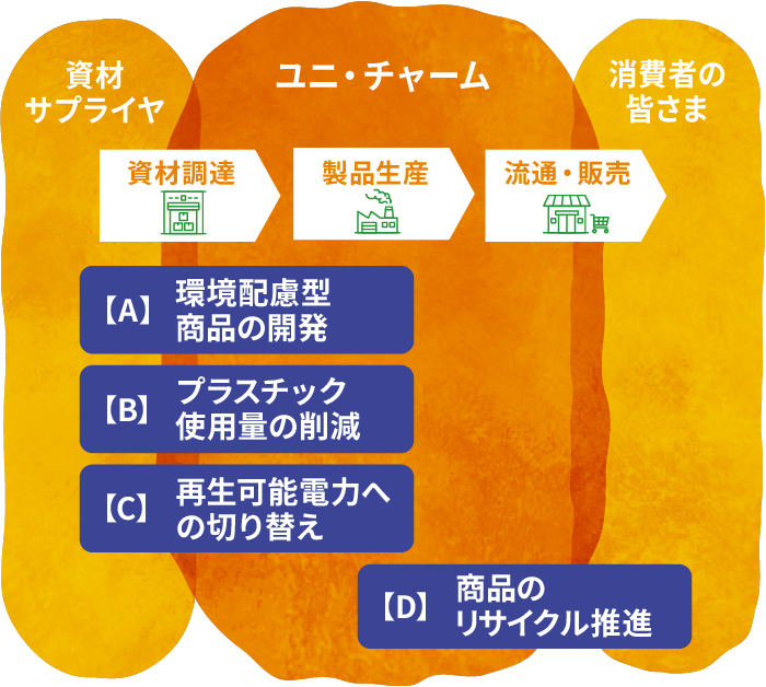 品生産、流通・販売のすべての工程で【A】~【D】をテーマに「CO₂削減活動」を行っています。