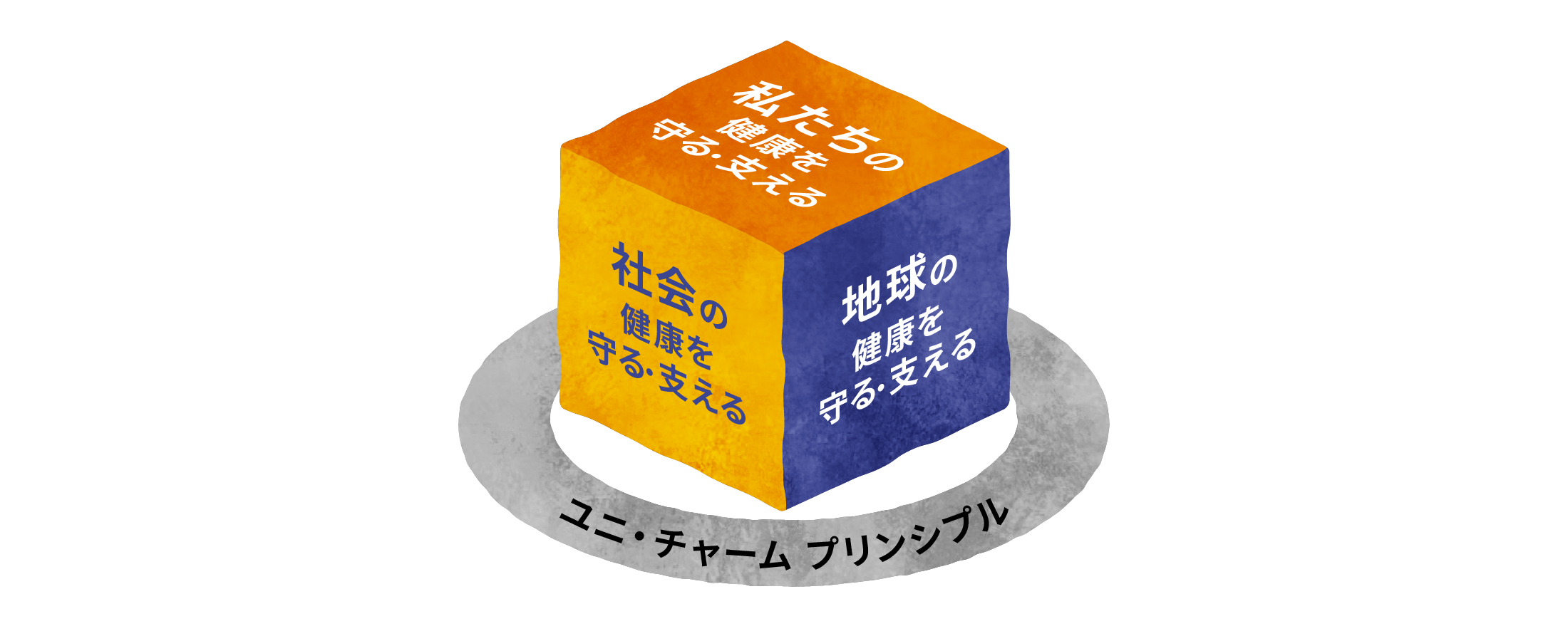 共生社会の実現のために「私たちの健康を守る・支える」「社会の健康を守る・支える」「地球の健康を守る・支える」の3つの柱に加え「ユニ・チャーム プリンシプル」があります。