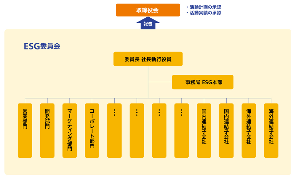 当社では、サステナビリティマネジメントを着実に実行すべく適切な体制を構築しています。具体的には、社長執行役員を委員長とするESG委員会を年4回開催し、サステナビリティ全般およびガバナンスに関する方針や活動内容について審議・決定し、その進捗状況のモニタリングを行います。ESG委員会には、取締役や執行役員といった経営層に加えて、営業部門や開発部門、マーケティング部門、コーポレート部門、国内外の連結子会社の責任者が出席することで、決定したサステナビリティ関連の諸活動を迅速に実行できる体制を構築しています。なお、ESG委員会での審議・決定内容については、取締役会に年1回以上報告しています。