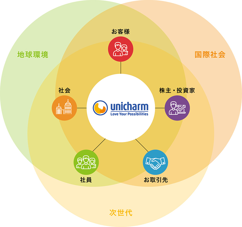 今後も、私たちユニ・チャームは、自然環境問題や社会課題への対応、適切なガバナンスを維持することが、持続的な企業価値向上に必須であることを念頭に、一層の取り組み強化を進めます。また、国際的な基準に沿った情報開示を拡充し、お客様、株主、お取引先、社員とその家族、地域社会といったすべてのステークホルダーから信頼していただける企業へと成長することを目指します。